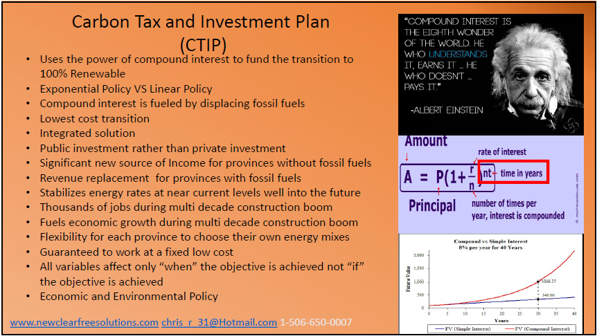 New Clear Free Solutions, a citizen based energy think tank, will be presenting a new Carbon Tax plan to the Select Committee on Climate Change. The Carbon Tax and Investment Plan (CTIP), takes advantage of compound interest to transition to 100% renewables. The select committee will hear New Clear Free Solutions at Delta Brunswick, 39 King Street, Saint John, N.B. at 5:00 in the evening, on September 7.